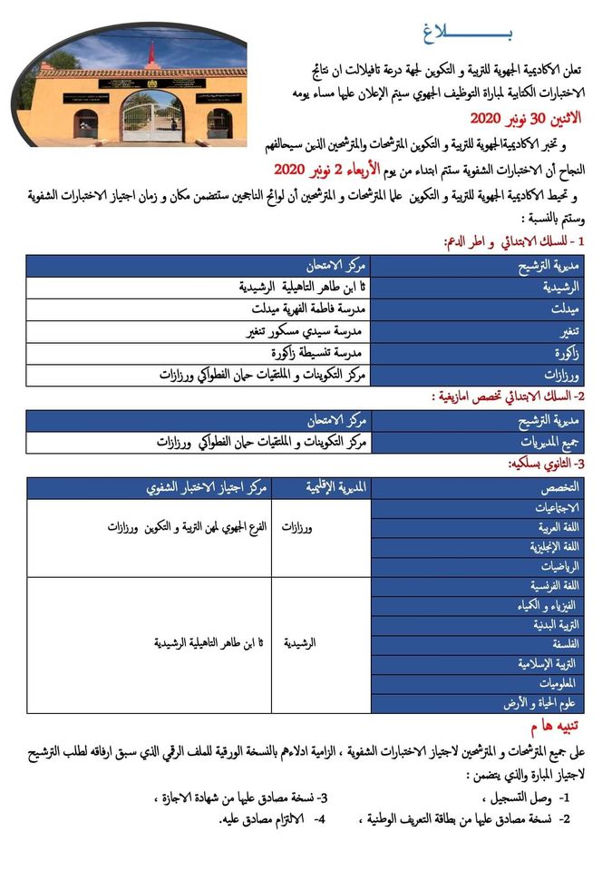 مباريات التعاقد نتائج مباراة التعليم 2020 توظيف أطر الأكاديمية الجهوية درعة تافيلالت (بلاغ) Admin نتائج مباراة التعليم 2020 توظيف أطر الأكاديمية الجهوية درعة تافيلالت (بلاغ)نتائج مباراة التعليم 2020لوائح المدعوين لاجتياز الاختبارات الشفوية لمباراة توظيف أطر الاكاديمية 2020 Admin مقالات قد تهمك
