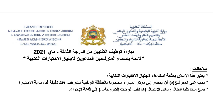 مستجدات التعليم الأكاديمية الجهوية الرباط سلا القنيطرة المدعوين لمباريات توظيف 07 مهندسي دولة و10 متصرفين و23 تقني بقطاع التربية الوطنية 2021 Admin الأكاديمية الجهوية الرباط سلا القنيطرةلائحة المدعوين لمباريات توظيف 07 مهندسي دولة و10 متصرفين و23 تقني بقطاع التربية الوطنية 2021لائحة بأسماء المترشحين المدعوين لاجتياز الاختبارات الكتابية- ماي 2021مهندسي الدولة من الدرجة الأولىالمتصرفين من الدرجة الثانيةالتقنيين من الدرجة الثالثةمواقيت إجراء الاختبارات الكتابية Admin مقالات قد تهمك