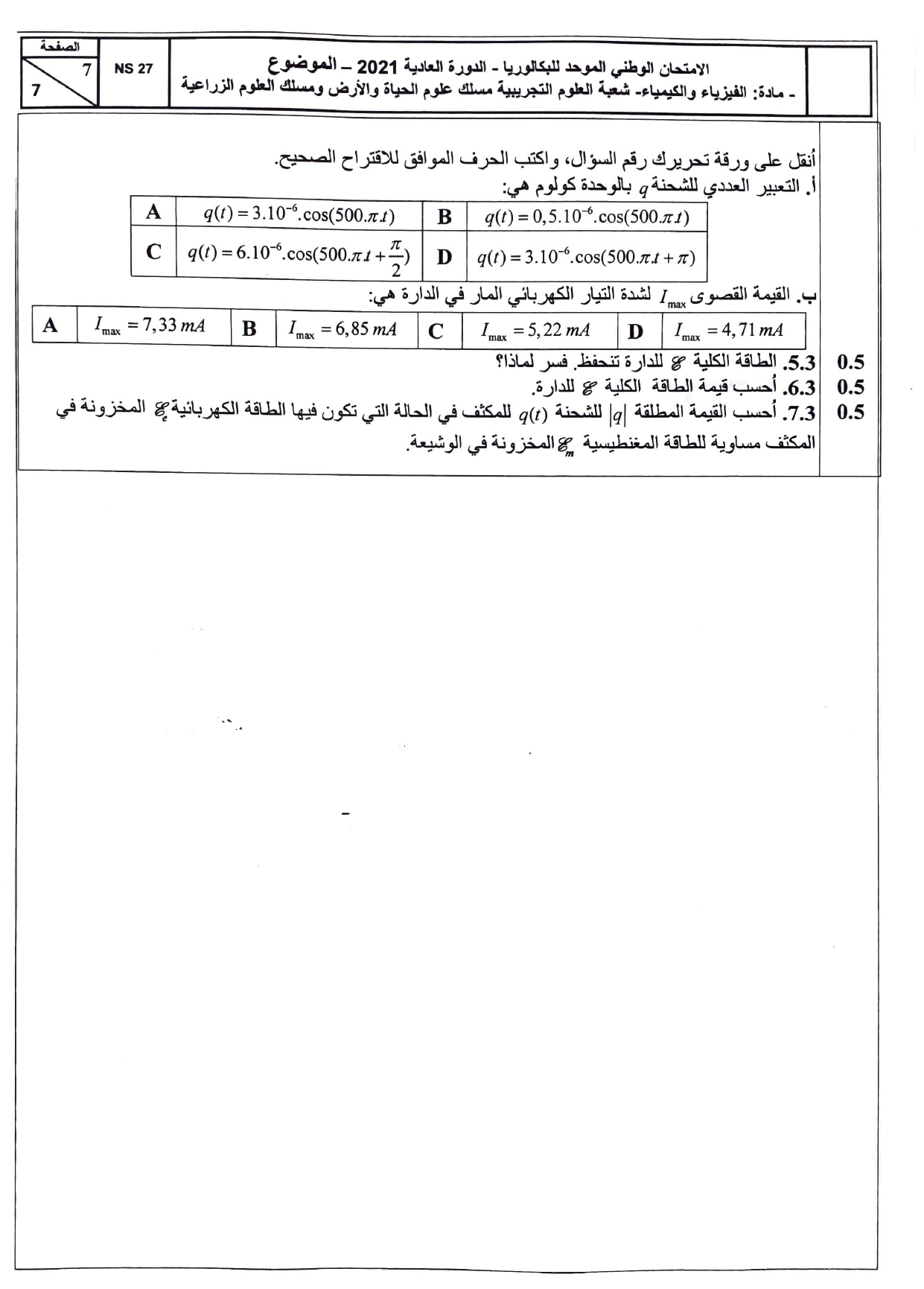 الامتحان الوطني لمادة الفيزياء والكيمياء شعبة العلوم التجريبية 2021