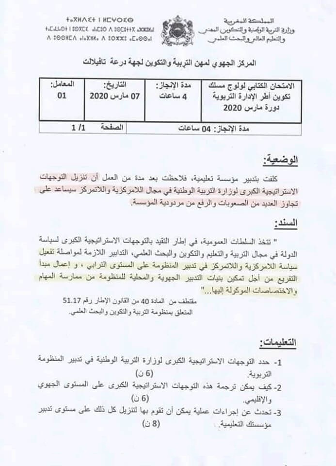 نماذج مباراة أطر الإدارة التربوية جهة درعة تافيلالت دورة 2020