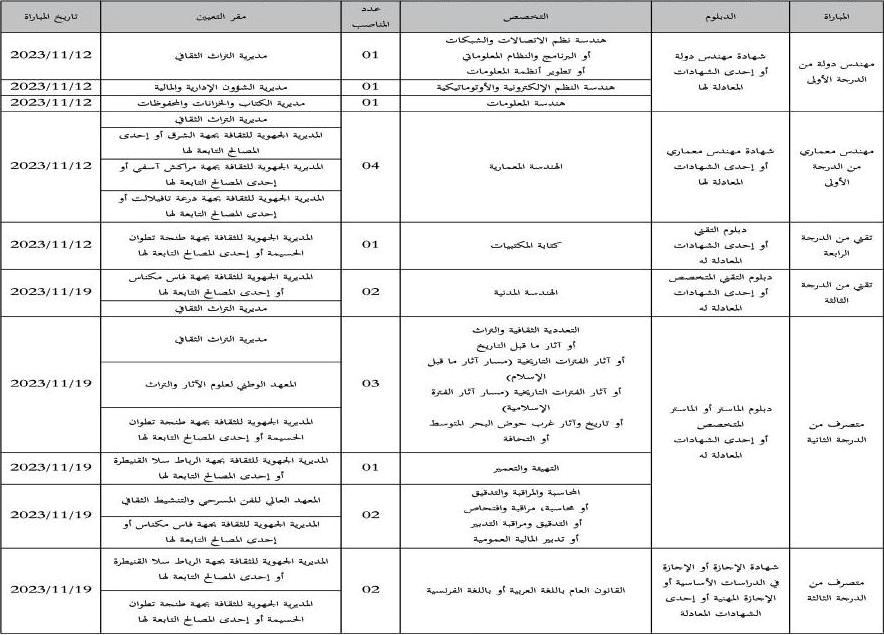 تنظم وزارة الشباب والثقافة والتواصل - قطاع الثقافة - مباريات توظيف بالمدرسة العليا للتكنولوجيا الكائنة بشارع ولي العهد بسلا، وعند الاقتضاء بأي مقر يتم تحديده لاحقا.