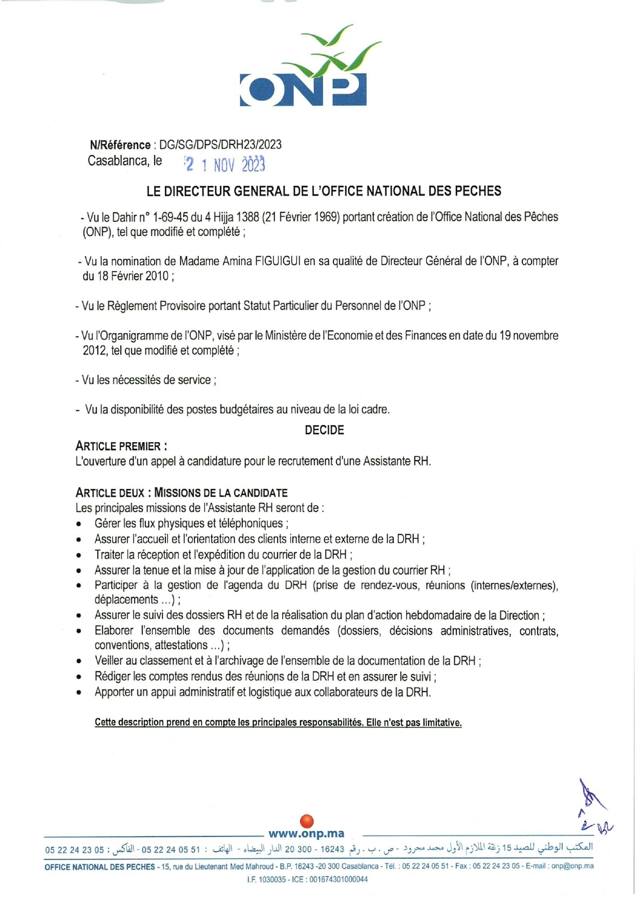 مباراة توظيف 1 مساعدة في الموارد البشرية بالمكتب الوطني للصيد 2023